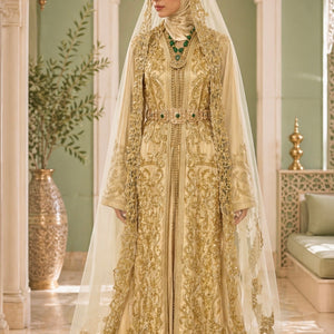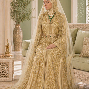 Luxury Gold Bridal Takchita with Beaded Embroidery & Veil with Train Moroccan Caftan