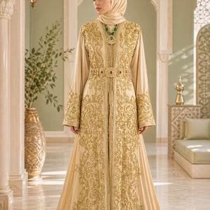 Elegant bridal two-piece Moroccan takchita, plus-size friendly depending on measurements, made from luxurious Crêpe de Korea, fully lined in satin gold for a smooth, graceful drape. Adorned with intricate gold embroidery, beading, pearls, and sequins throughout the design.