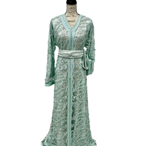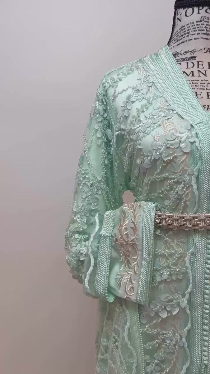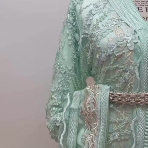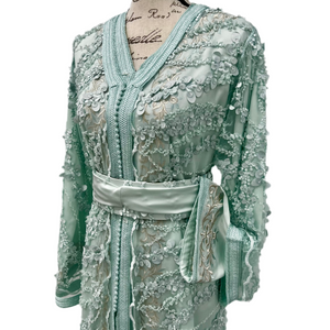 Exquisite handmade two-piece tulle caftan designed to captivate. The outer caftan is from tulle fabric, shimmers with intricate floral appliqué and delicate beadwork, while the inner caftan from silk drape (drap de soie) features refined embroidery for a touch of timeless elegance. Finished with a statement belt to accentuate the waist, this masterpiece is perfect for a bride, mother of the bride or any special occasion where sophistication and luxury are a must.