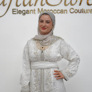 This breathtaking bridal caftan is crafted in a true snow-white palette with a fully embroidered sheer tulle outer layer. The inner satin caftan is luxuriously smooth and structured for a refined silhouette. Paired with elegant embroidery on the sleeves and a bold jeweled belt, this piece is perfect for the bride who wants to shine in timeless elegance.