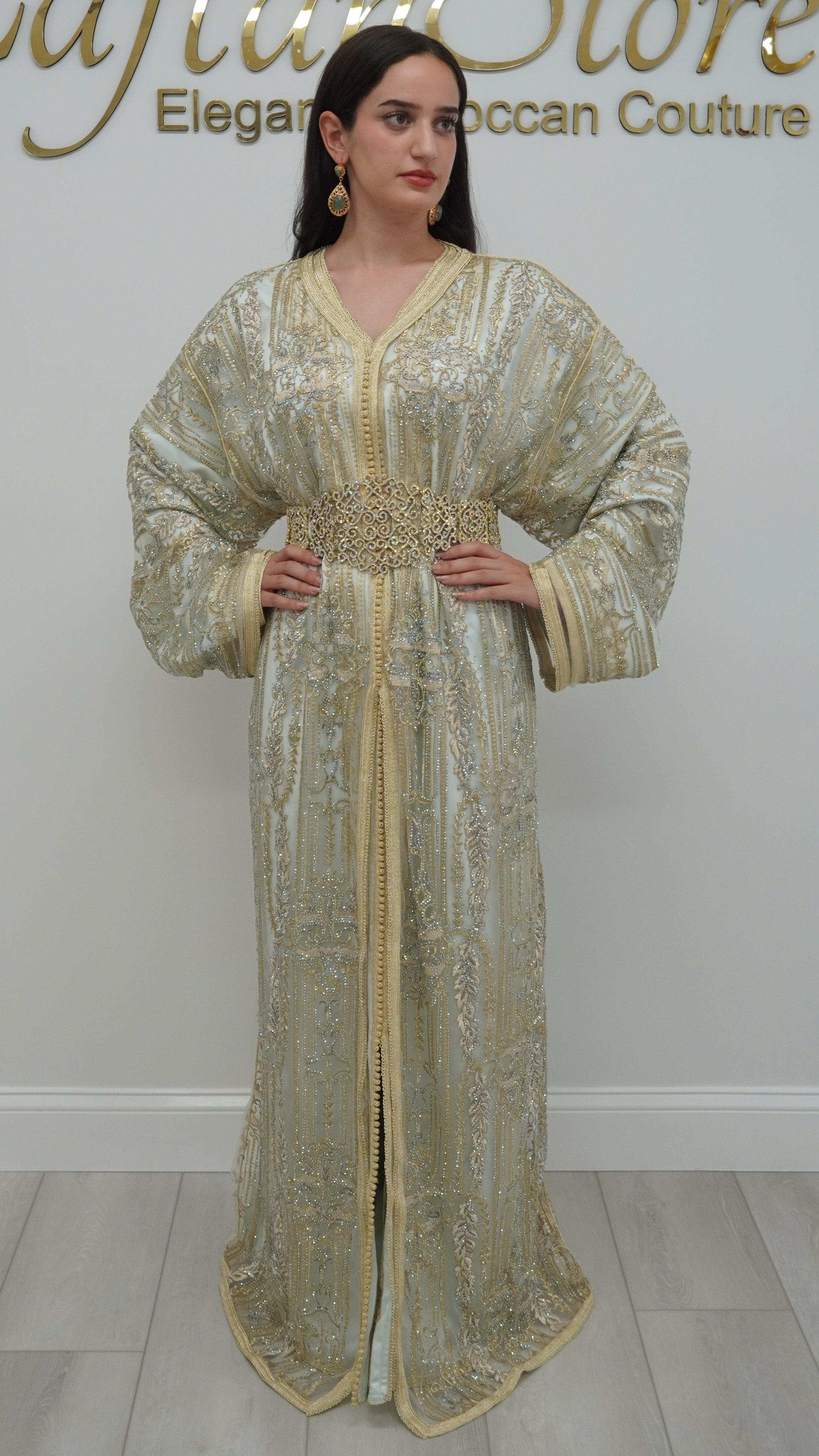 Royal Green & Gold Embroidered 2-Piece Moroccan Caftan with Optional Veil & Accessories