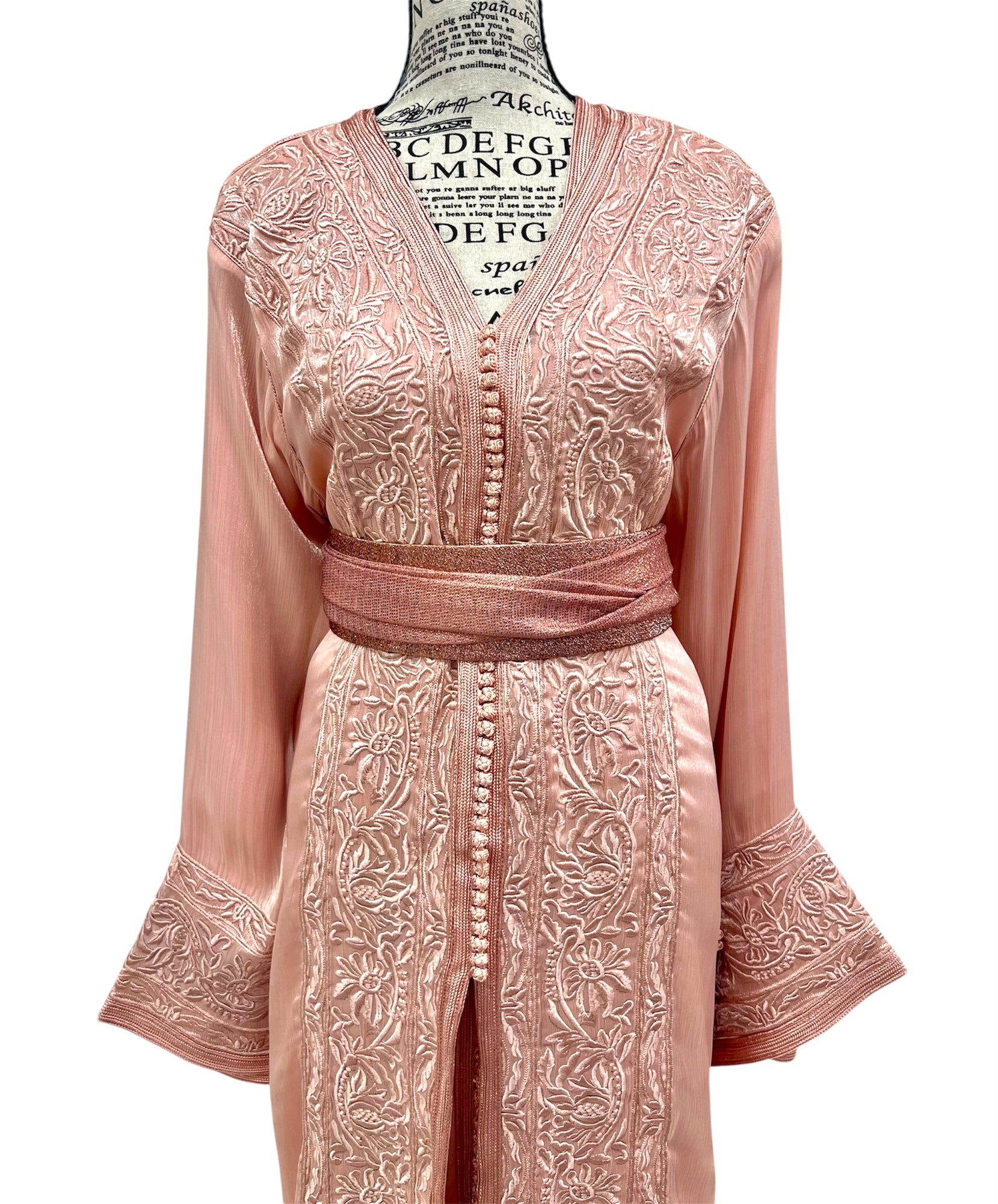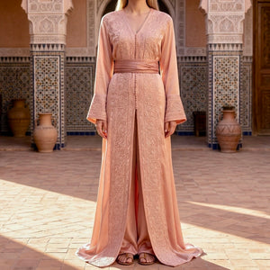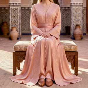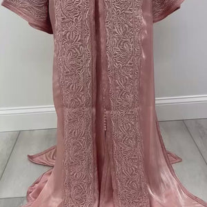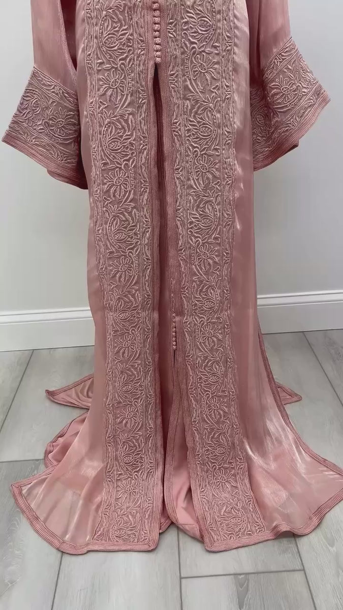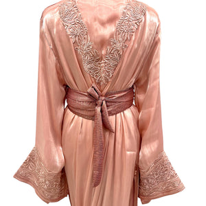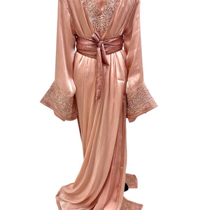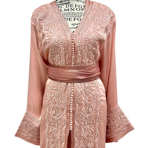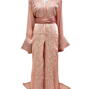 Elegant Moroccan takchita featuring a blush organza outer layer with intricate embroidery and a satin silk inner caftan. Includes a matching belt for versatile looks. Perfect for special occasions.