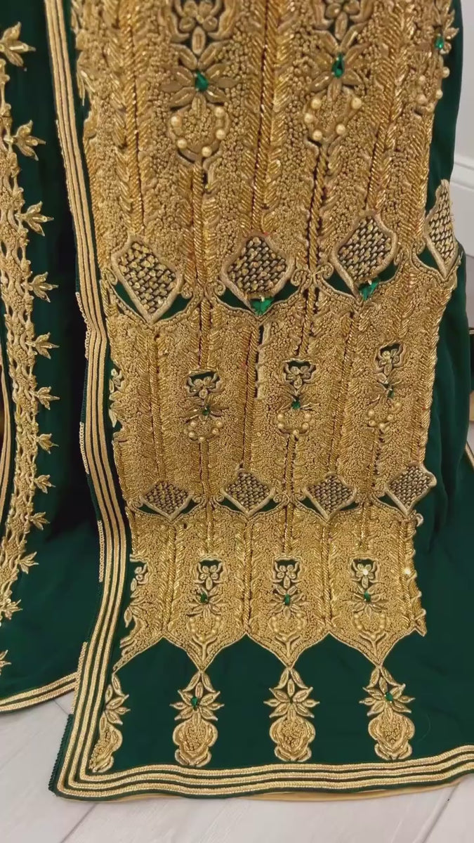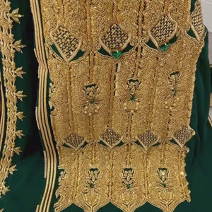 An unforgettable two-piece Moroccan bridal caftan (takchita) in rich emerald green, adorned with intricate hand-beaded gold embroidery, delicate gold pearls, and luminous emerald stones. Designed with traditional motifs along the front, sleeves, and back, it flows with regal elegance and timeless charm.