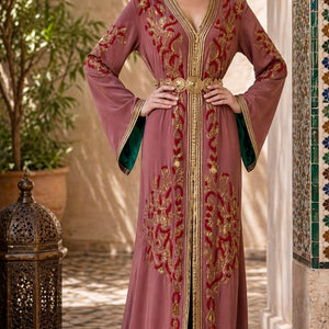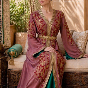 This elegant two-piece caftan features a luxurious green satin lining, providing a refined and exquisite look. The mauve-colored outer layer is made of crepe fabric, adorned with intricate gold and red handmade beading along the front and sleeves for a stunning visual effect. The back also displays elaborate beading, adding to the caftan's overall sophistication and elegance. This piece is ideal for making a statement at any special occasion.