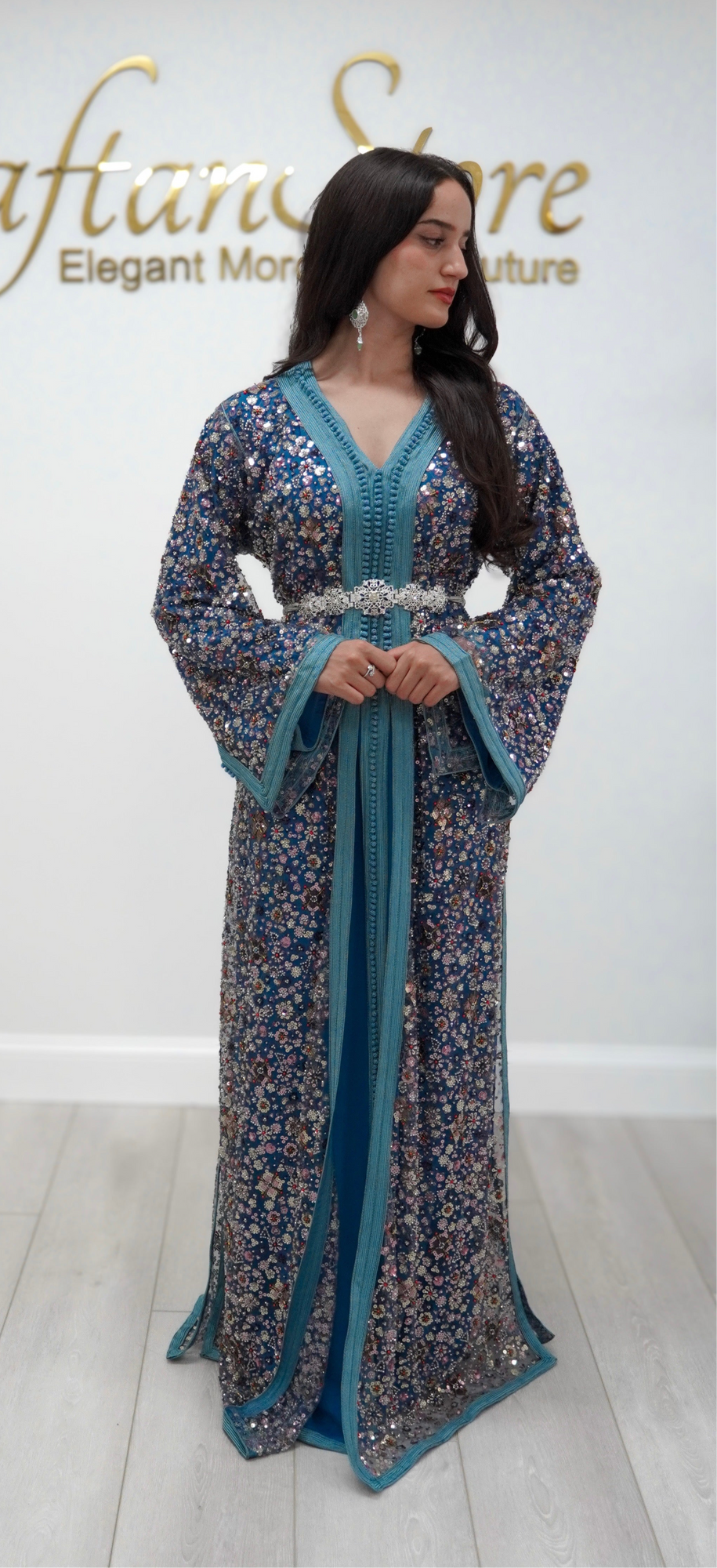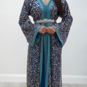Be the best dressed guest in this breathtaking two-piece teal Moroccan caftan. Featuring a luxurious light crepe inner piece and a fully embellished tulle overlay with shimmering floral beadwork and sequins, it’s finished with a striking silver belt for an unforgettable look.
