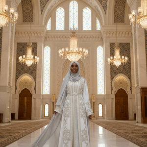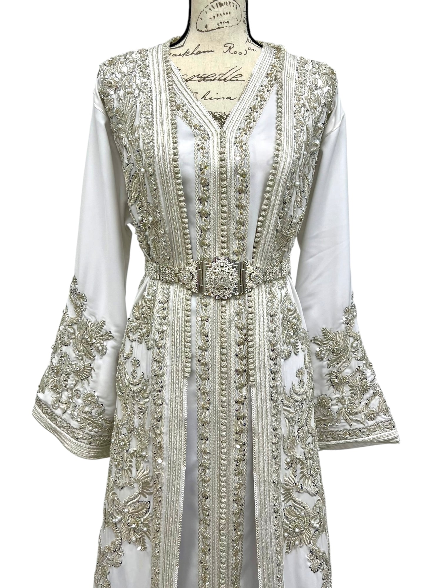 Elegant two-piece white Moroccan bridal takchita featuring a sleeveless inner dress, fully hand beaded and embroidered from the neckline down. Paired with an open duster caftan, intricately embellished throughout, with detailed back work and a graceful beaded train. Includes a complementary matching belt. Veil available separately. Perfect for weddings and nikkah.