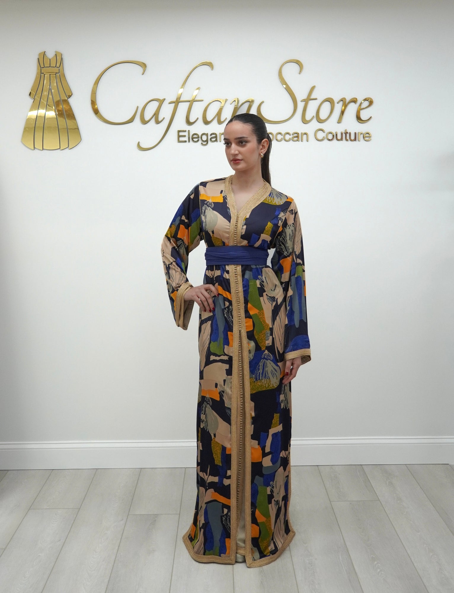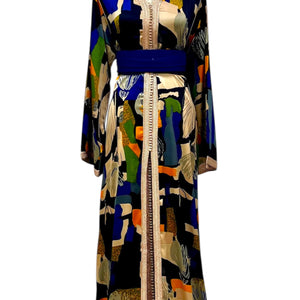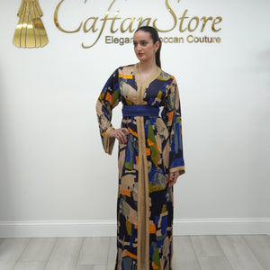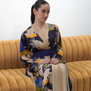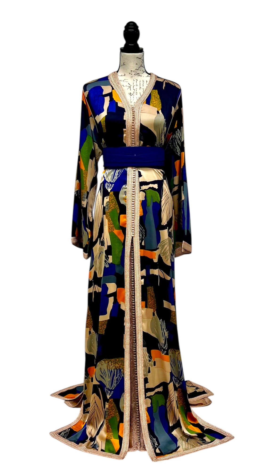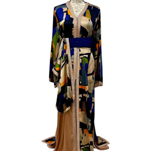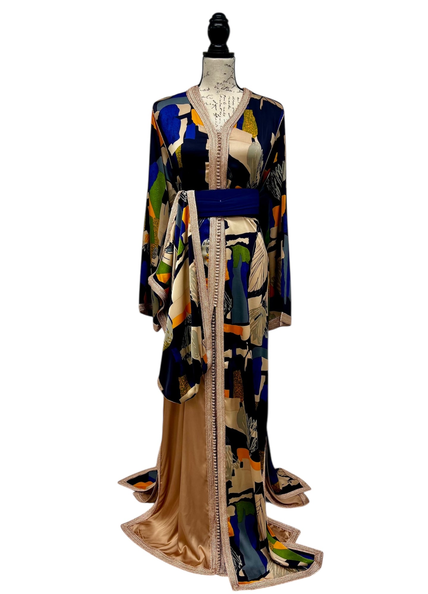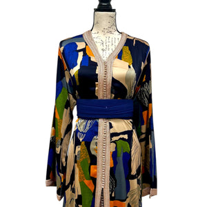 This elegant two-piece Moroccan caftan is crafted from luxurious satin silk, offering a graceful and fluid silhouette. The inner piece comes in a warm champagne beige satin, creating a smooth and refined foundation. The outer layer features a striking abstract print inspired by modern art, blending layered shapes and organic motifs in royal blue, champagne, olive green, and soft mustard tones.