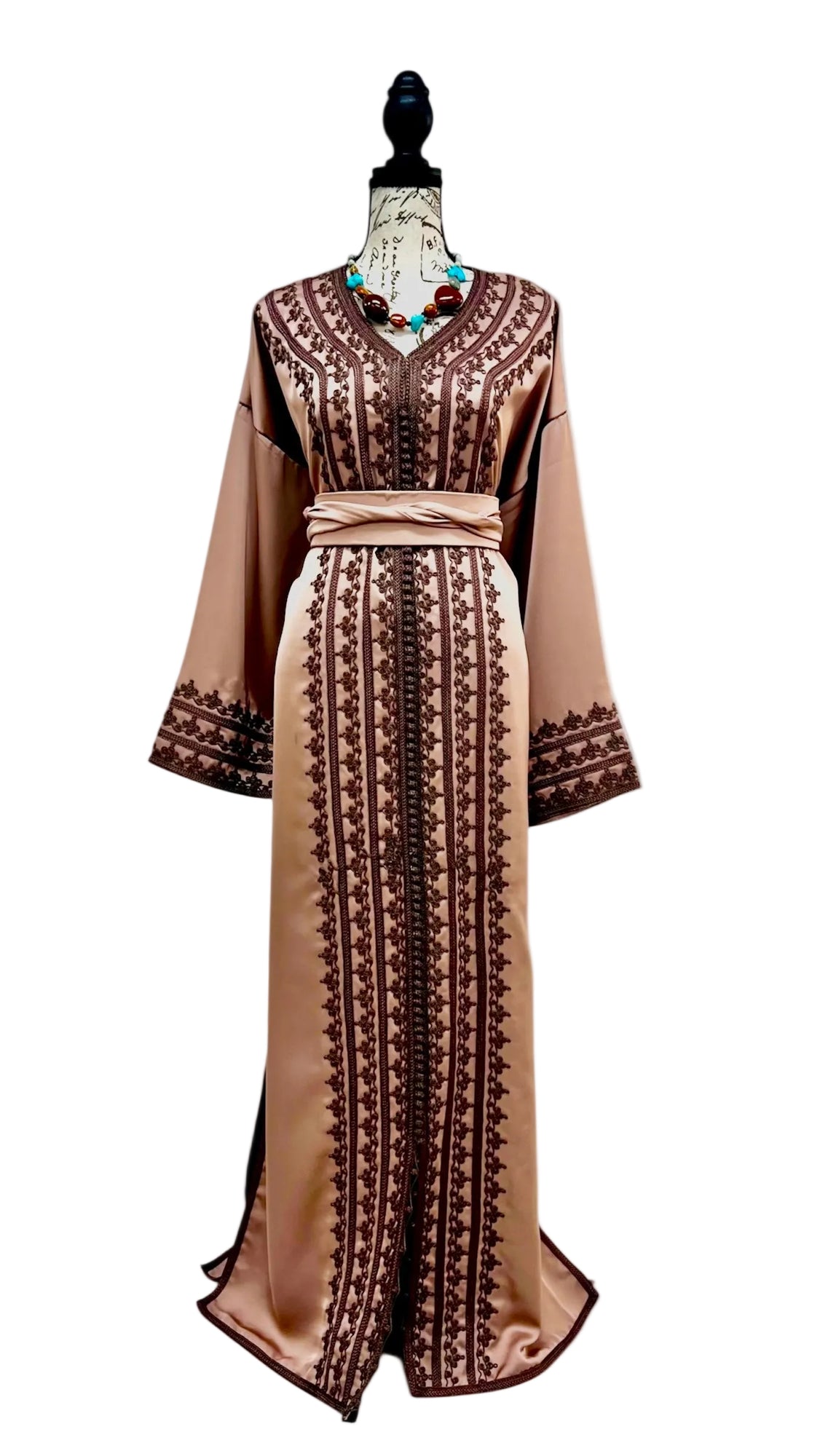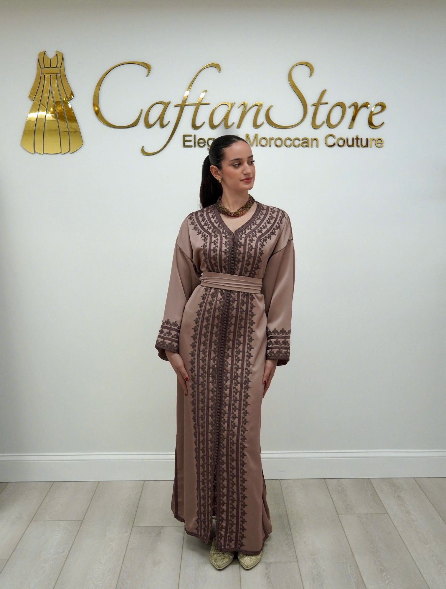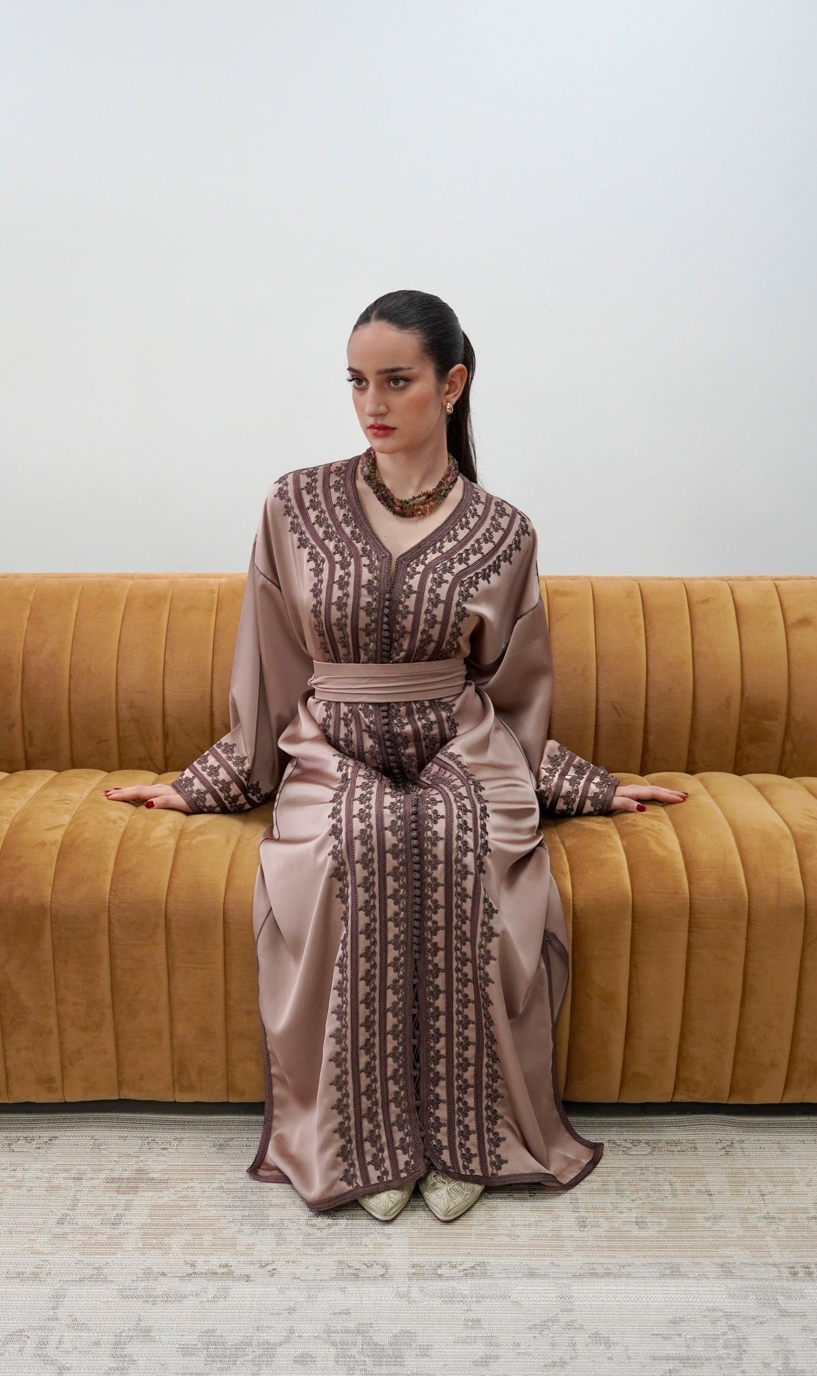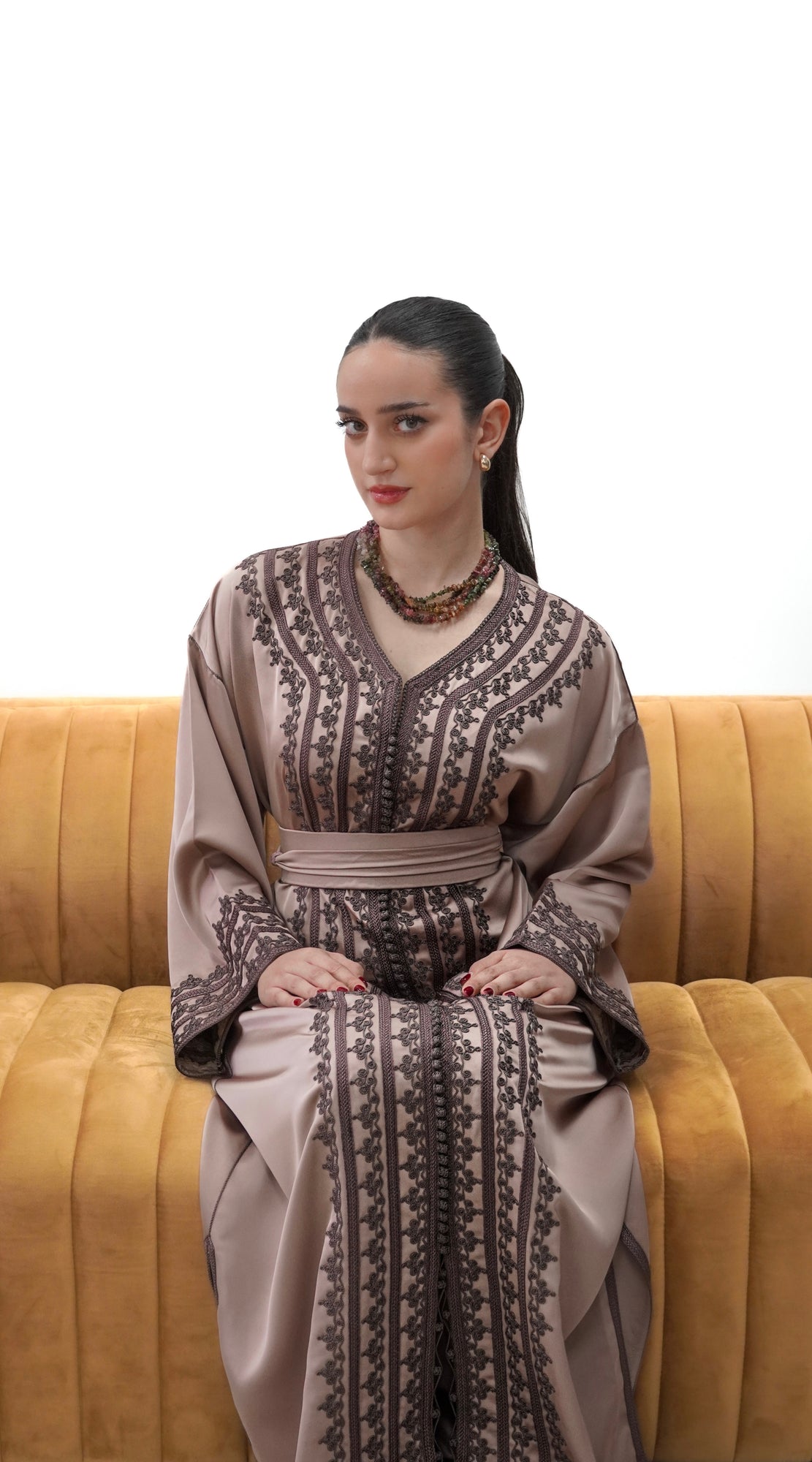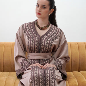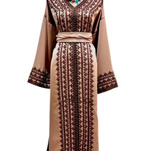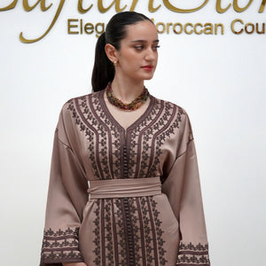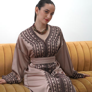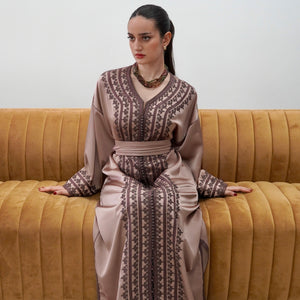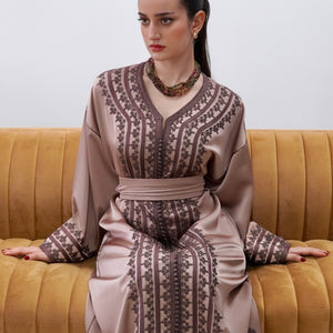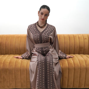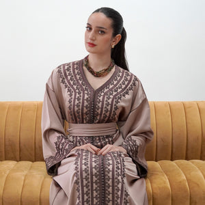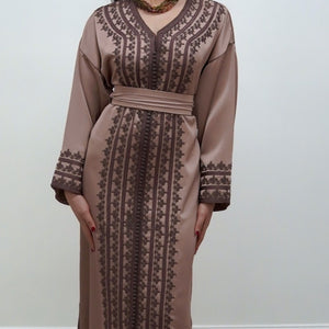 Elegant drap de soie caftan in a soft mocha tone, detailed with delicate embroidery along the front and sleeves. Designed with a flattering V-neckline, relaxed flowing sleeves, and a fluid silhouette. Comes with a matching belt, and can also be worn without the belt to highlight the embroidery for a more effortless look.