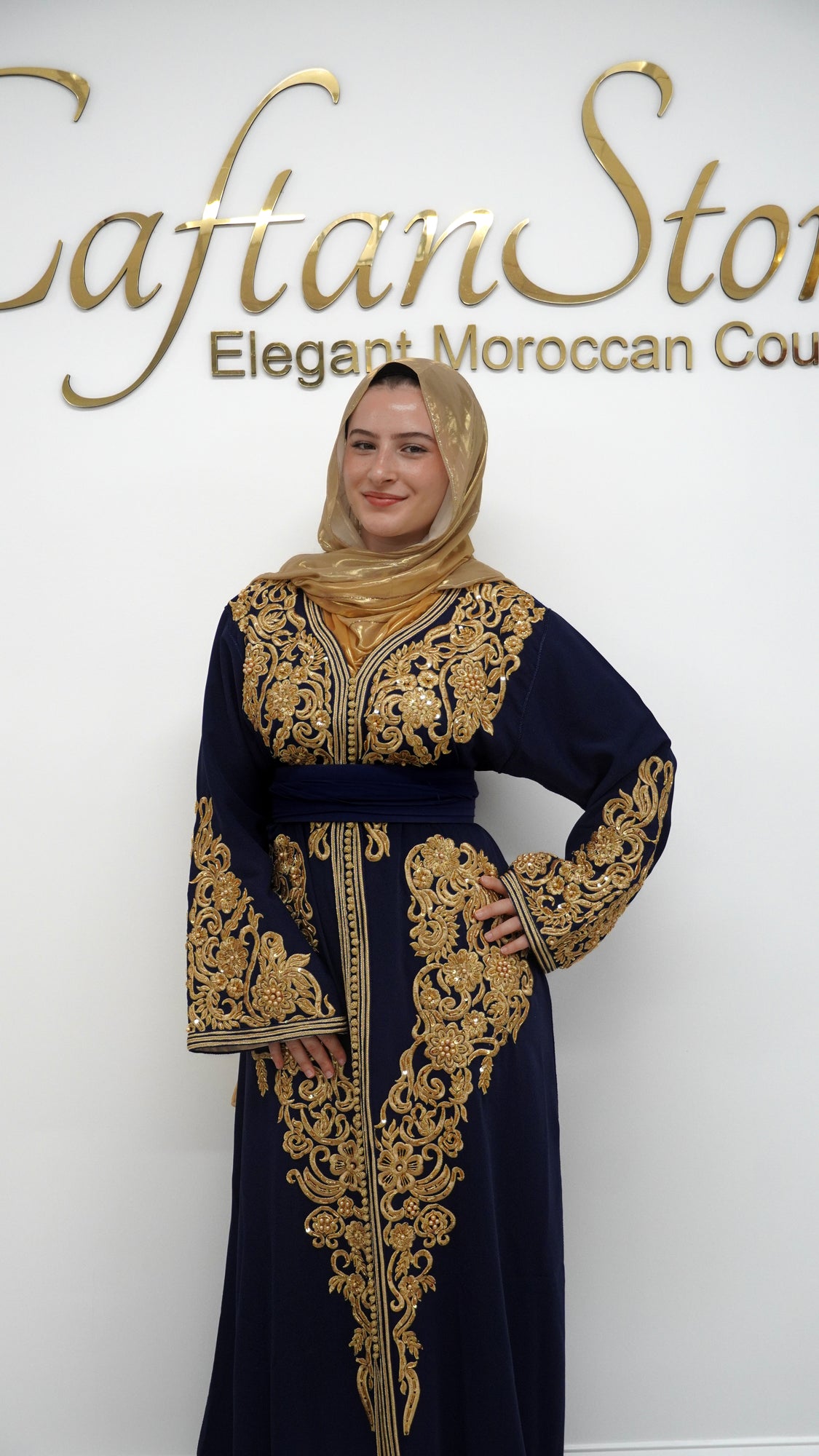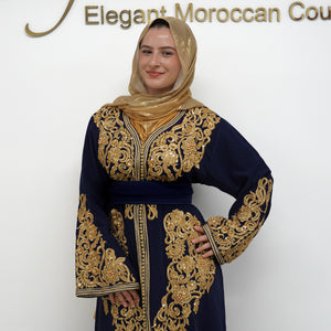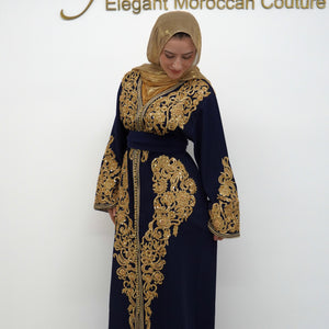 Crafted from luxurious crepe fabric, this navy blue one-piece caftan is adorned with intricate gold embroidery and delicate beading across the front and back. The sleeves are lined with satin gold for an extra hint of glam. It can be worn without a belt to let the detailed craftsmanship shine, allowing the golden design and beading to speak for themselves. A complementary belt is also included for those who prefer a cinched, regal silhouette.