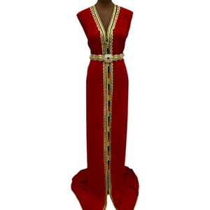 This breathtaking two-piece emerald green caftan features a vibrant orange satin lining that adds a bold, unforgettable contrast. Embellished with intricate gold embroidery and delicate beadwork, it radiates elegance and charm, ideal for a bride or the best-dressed guest.