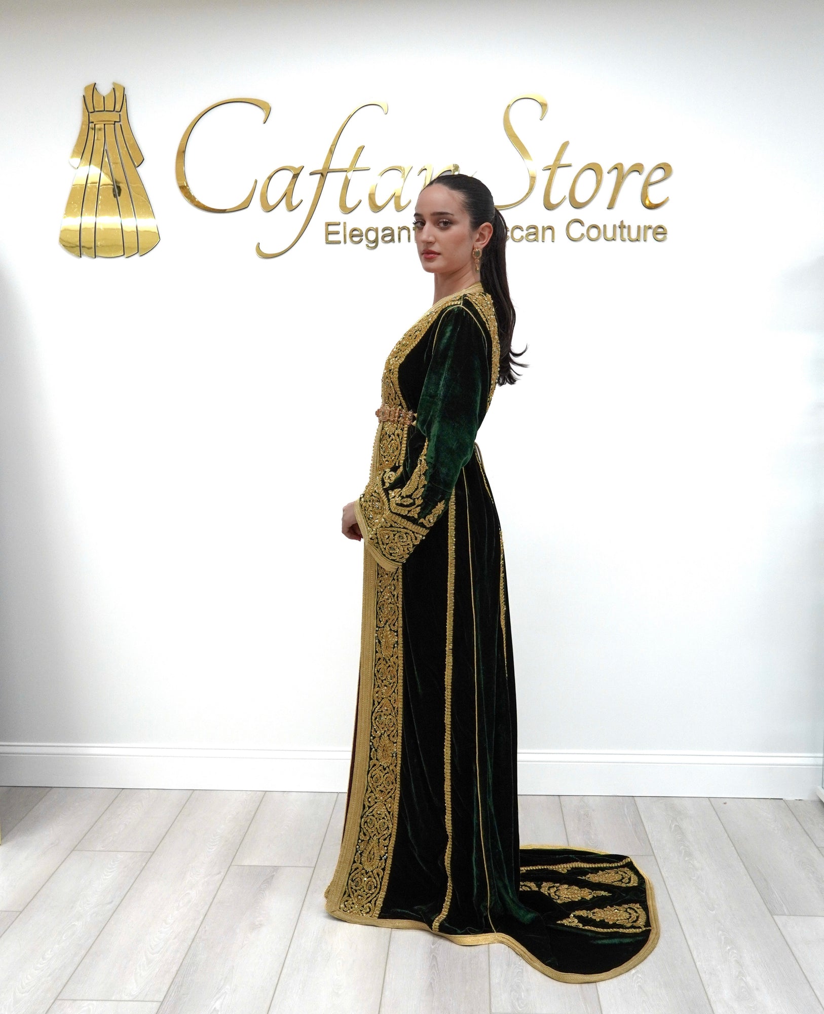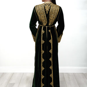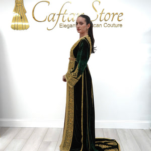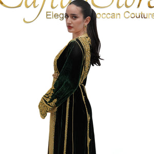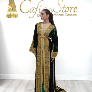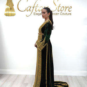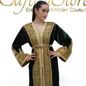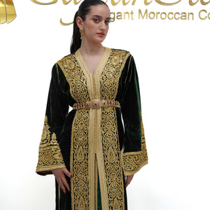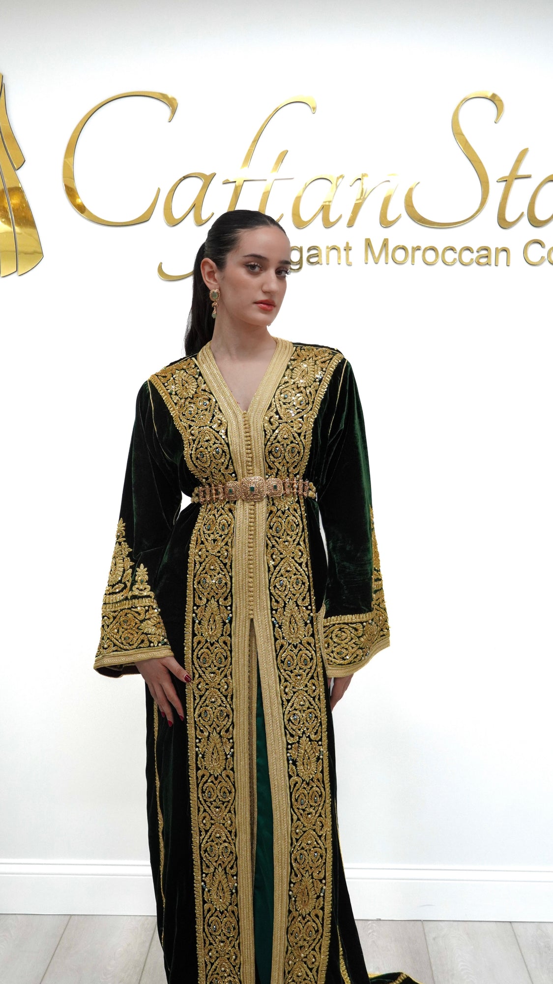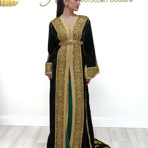 Silk velvet two-piece Moroccan caftan in a rich roval green tone, adorned with intricate gold embroidery and hand-beaded details. Designed with traditional motifs on the front, sleeves, and back, it offers a regal and timeless silhouette. Styled with a display belt for presentation; each caftan includes its own complementary matching belt to complete the look.