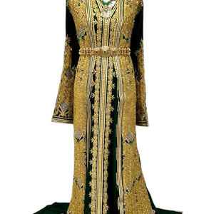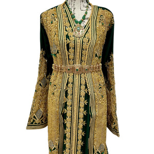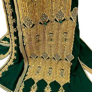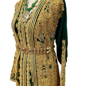 An unforgettable two-piece Moroccan bridal caftan in rich emerald green, adorned with intricate hand-beaded gold embroidery, delicate gold pearls, and luminous emerald stones. Designed with traditional motifs along the front, sleeves, and back, it flows with regal elegance and timeless charm. The belt shown is for display; a complementary matching belt will be included to complete your royal look.