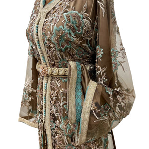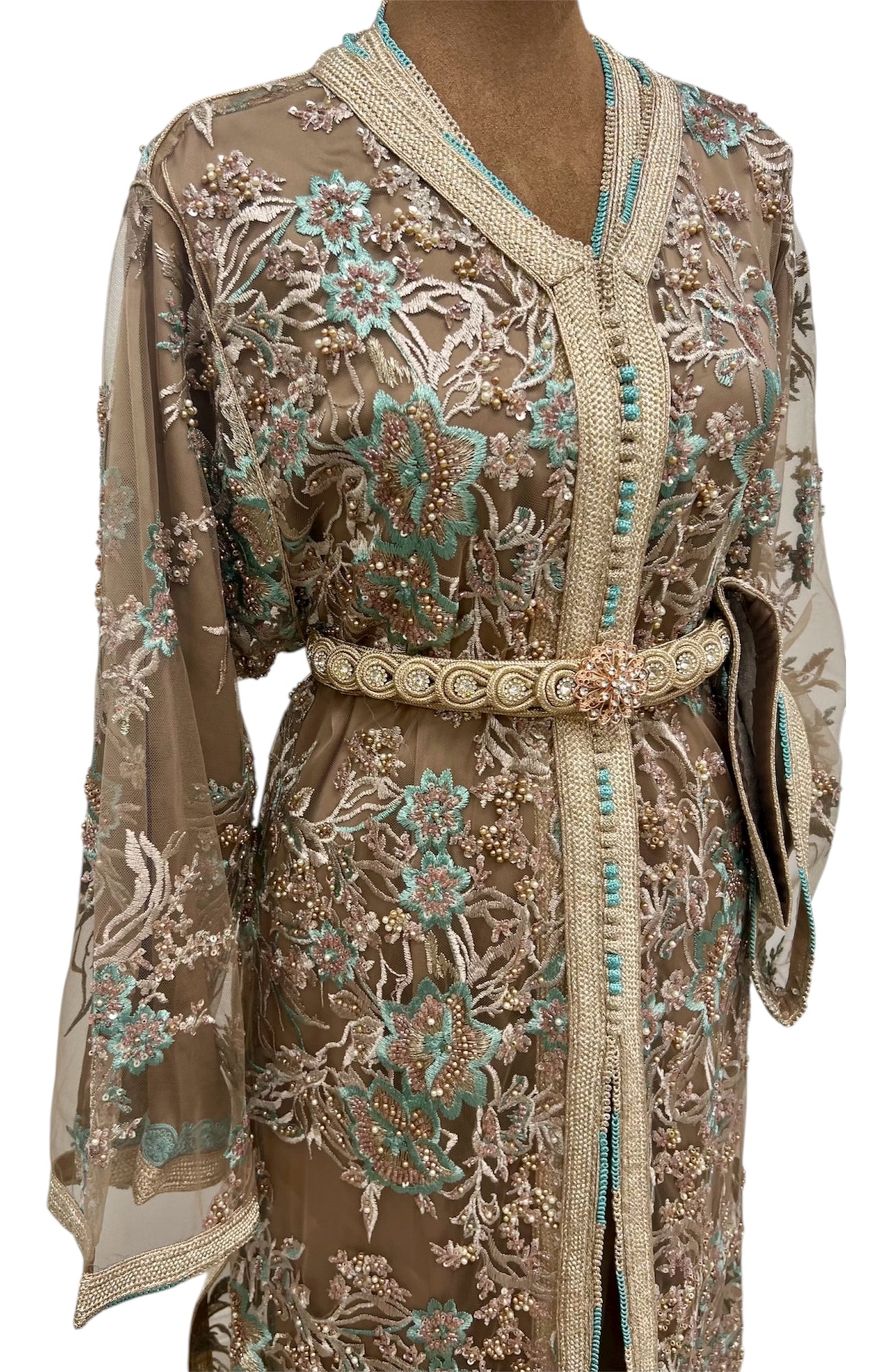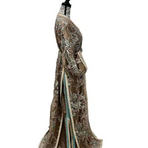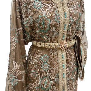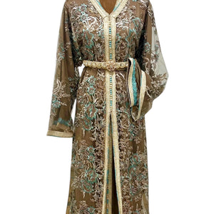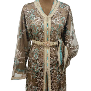 Elegant two-piece tulle caftan with intricate hand embroidery in teal, and pearl tones. The inner caftan features matching embroidery on the cuffs and sides. Finished with a handmade embellished belt. Perfect for special occasions.