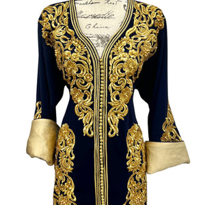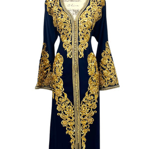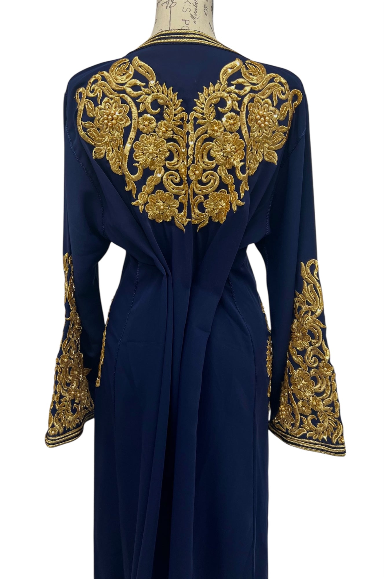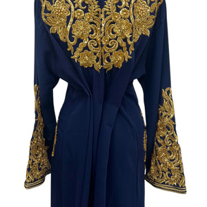 Crafted from luxurious crepe fabric, this navy blue one-piece caftan is adorned with intricate gold embroidery and delicate beading across the front and back. The sleeves are lined with satin gold for an extra hint of glam. It can be worn without a belt to let the detailed craftsmanship shine, allowing the golden design and beading to speak for themselves. A complementary belt is also included for those who prefer a cinched, regal silhouette.