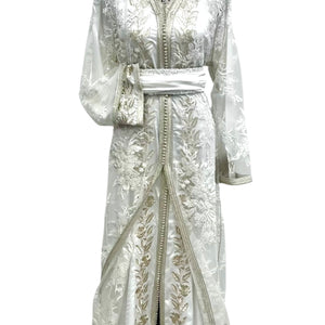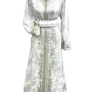 A delicate blend of tradition and grace, this small bridal caftan features a sheer tulle outer layer embroidered with shimmering floral motifs. The inner piece is crafted from luxurious drap de soie, offering a soft satin finish that can be worn on its own for a second elegant look. Includes a complementary satin belt. Ideal for nikkah, bridal showers, or intimate weddings.